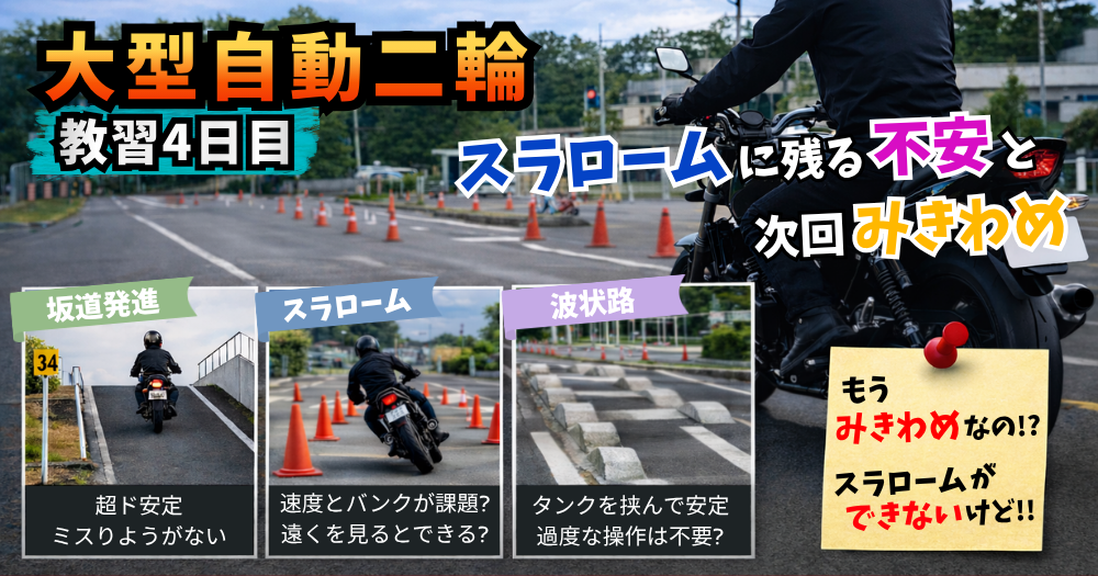 大型自動二輪教習もいよいよ4日目に突入。 これまでの総復習が中心となり、みきわめや卒業検定に向けた、仕上げの段階に入ってきたかもしれません。 今回は、「坂道発進」が新たな課題として追加。それぞれの所感をまとめていきます。 教習内容(4日目) ■... -